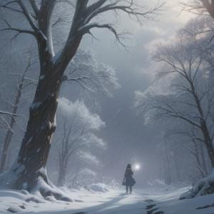 A serene illustration of a snowstorm, mystical energy swirling, ethereal light breaking through snowflakes, symbolizing spiritual transformation, contrasting dark trees against the white snow, a peaceful yet powerful atmosphere, subtle hints of ancient wisdom in the air, 4k