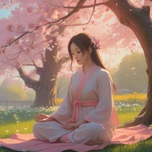 A serene spring equinox scene, gentle sunlight filtering through blossoming cherry trees, a tranquil landscape, soft grass carpet, a sense of awakening and renewal, dreamy atmosphere, spiritual reflection, calming energy, nature's harmony, vibrant colors, peaceful meditation, 4k