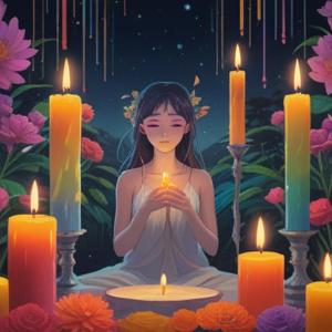 A serene and uplifting illustration depicting a spiritual birthday celebration, glowing candles surrounded by vibrant flowers, ethereal light illuminating the scene, joyful individuals in a circle, engaging in a spiritual ritual, harmonious energy in the air, soft pastel colors, 4k