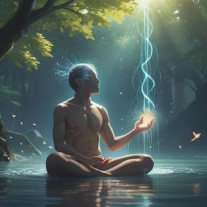 A serene illustration depicting a person meditating in a tranquil environment, vibrant light emanating from their mind, symbols of spiritual awakening surrounding them, soft aura and glowing energies, lush greenery and peaceful nature, harmonious balance, uplifting and positive feelings, 4k
