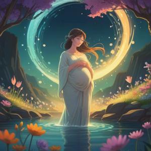 A serene and mystical illustration depicting a pregnant woman surrounded by ethereal light, symbolic representations of time, such as flowing hourglasses and blooming flowers, a peaceful expression on her face, nature elements like gentle winds and soft colors, emphasizing the spiritual connection to motherhood, 4k