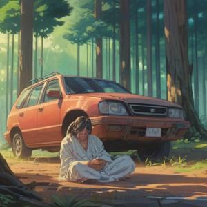 A serene moment of reflection after a car accident, a calm person sitting on a curb, eyes closed, taking deep breaths, soothing nature background with gentle sunlight filtering through trees, feelings of tranquility and healing, soft focus, emotional depth, 4k