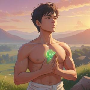 A tranquil scene depicting a person holding their left chest, surrounded by a soft, ethereal glow, symbolic representations of heart and emotions, serene landscape in the background, gentle colors reflecting calmness and healing, mystical elements like feathers and light orbs, suggestive of spiritual awakening, 4k