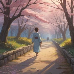 A serene landscape depicting a tranquil homecoming, soft ethereal light illuminating a familiar path, an inviting old house surrounded by lush greenery, a sense of peace and nostalgia, gentle breeze rustling leaves, vibrant sunset in the background, symbolizing spiritual growth and connection to one's roots, 4k