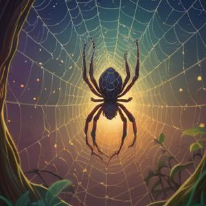 A mystical scene featuring a spider weaving an intricate web, vibrant hallucinations swirling around, symbolic messages hidden within the web, enchanting atmosphere with ethereal colors, a lucky charm glowing softly nearby, whimsical details and dreamlike elements, capturing the essence of luck and insight, 4k
