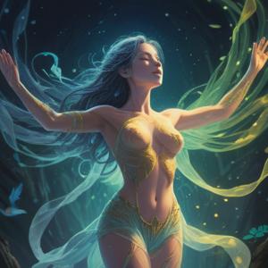 A mystical encounter with a glowing spirit guiding the way, vibrant light emanating from the right side, lush nature surrounding the scene, ethereal symbols in the air, serene atmosphere, a figure experiencing enlightenment, tranquility and hope, soft focus, enchanting landscape, 4k