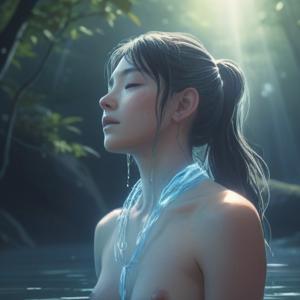 A serene scene depicting a person gently scratching their neck, surrounded by calming nature elements, soft light filtering through trees, symbolic representations of spiritual awakening, subtle hints of energy flow, a peaceful expression on their face, harmonious colors blending with nature, 4k