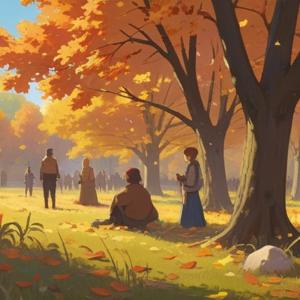A serene illustration capturing the essence of the autumn equinox, harmony of nature and spirit, balance of light and darkness, reflection and gratitude, vibrant autumn leaves falling, a circle of people meditating, warm golden light surrounding them, deep connection to earth and cosmos, tranquil atmosphere, 4k