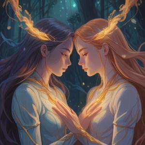 A serene and enchanting scene depicting twin flames, harmonious energy flows between two figures, each reflecting the other’s essence, soft golden light enveloping them, a tranquil garden setting with vibrant flowers, gentle breeze, a sense of deep connection and emotional healing, peaceful expressions on their faces, mystical aura surrounding them, pastel colors, 4k