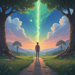 A serene illustration depicting a glowing light in a forest clearing, ethereal beings interacting joyfully, vibrant colors symbolizing positivity and connection, mystical aura surrounding the scene, deep spiritual energy, soft rays of sunlight filtering through the trees, harmonious atmosphere, elements of nature signifying new beginnings, 4k